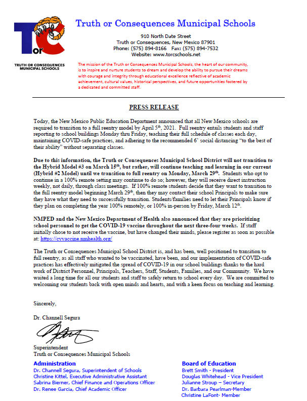 Full Reentry For ALL Students Monday, March 29th. Please read Letter below from Superintendent, Dr. Channell Segura