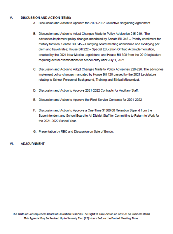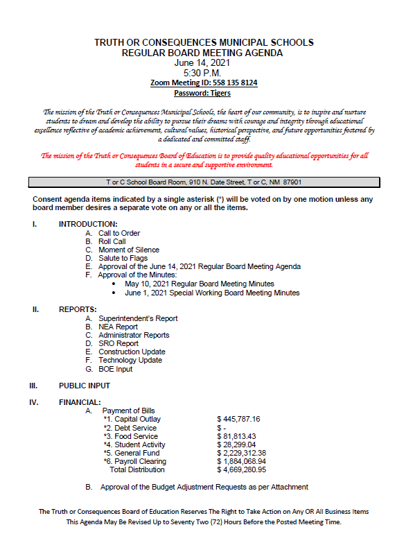 TorC School Board Meeting June 14, 2021 @ 5:30 pm.