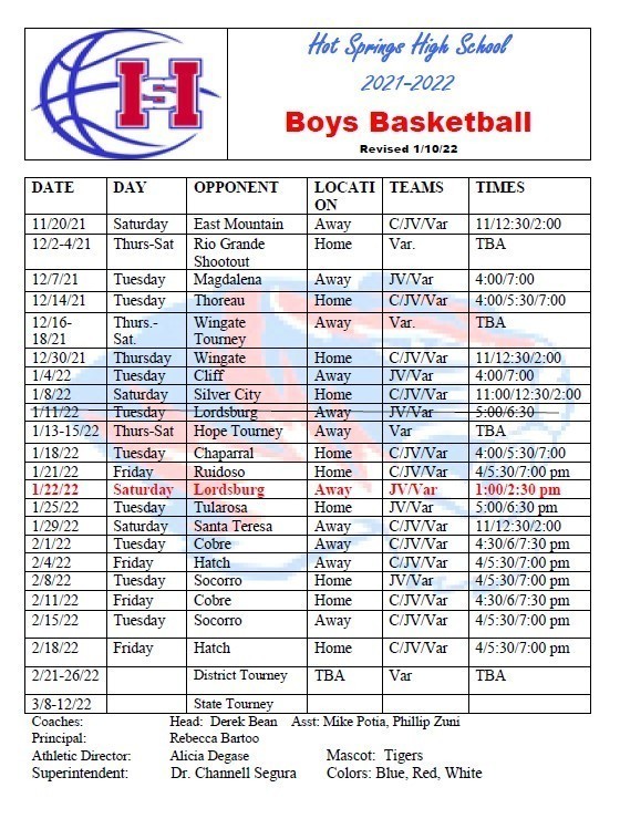 HSHS Boys Basketball Revised Schedule
