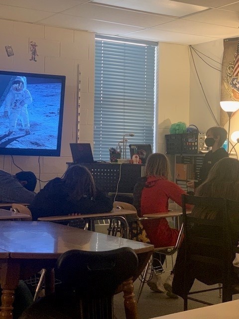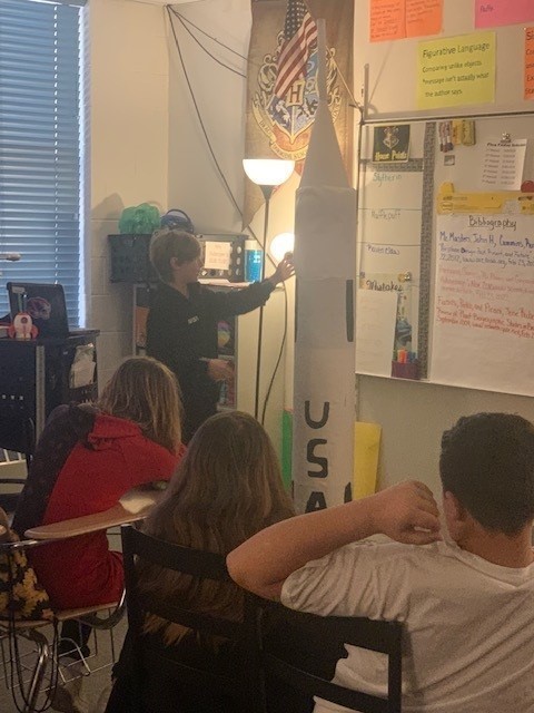 Merrick LaFont doing a presentation on the Saturn 5 rocket. (he also created the 8’ rocket he brought to class)