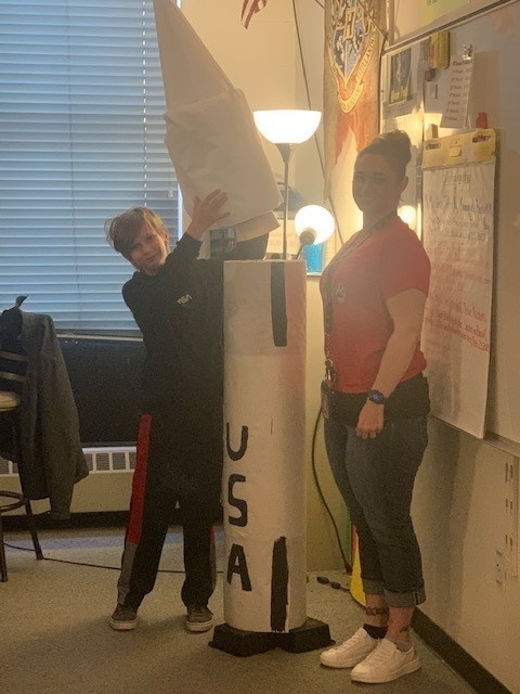 Merrick presenting his Saturn 5 rocket model that came apart in the two parts just like the actual Saturn 5 rockets.